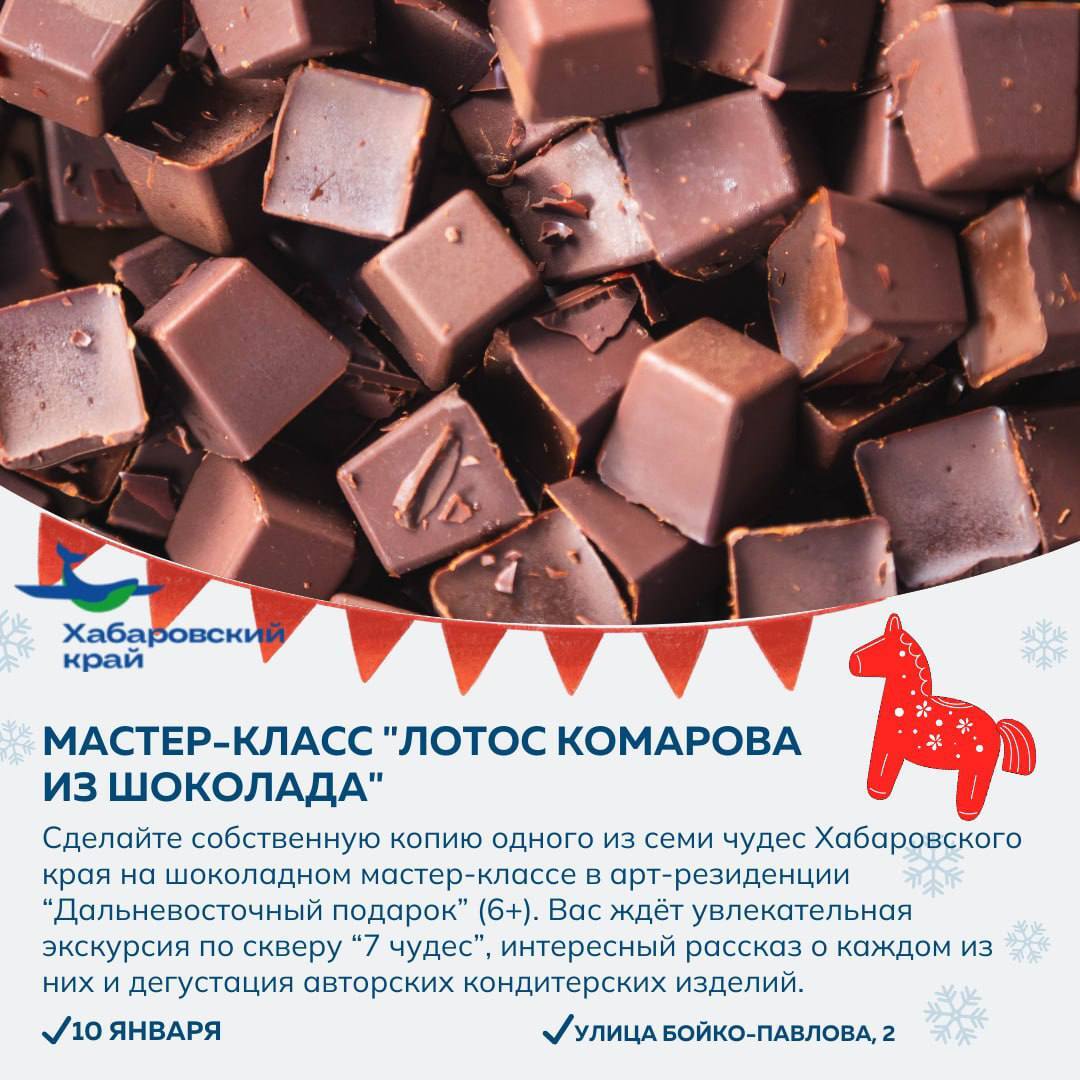 Отправиться в гастрономическое путешествие по Дальнему Востоку, узнать, как живет нанайский народ, посетить интерактивный спектакль, приобрести уникальные сувениры и сделать своими руками лотос Комарова из шоколада.