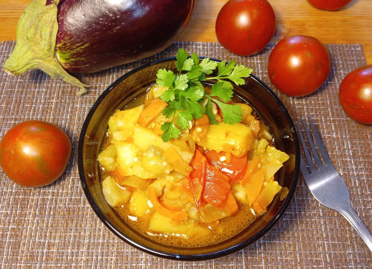 Для начала овощи следует подготовить: картофель нарезать крупными кубиками, баклажаны — небольшими кубиками, а лук, морковь и перец — как можно мельче. После этого картофель заливается холодной фильтрованной водой и ставится на средний огонь. Пока вода закипает, можно слегка обжарить баклажаны на сковороде с растительным маслом, а затем добавить их в кастрюлю с картофелем.