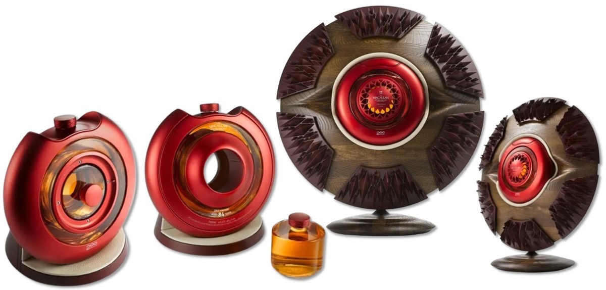 Этот изысканный виски представлен в футляре, включающем два резервуара: внешнее кольцо содержит самый старый виски, а внутри находится более молодой напиток 2018 года, выдержанный в таком же уникальном стиле. Внешний сосуд выполнен из дуба и украшен 200 шипами, символизирующими двухсотлетие компании и их стремление к защите окружающей среды.