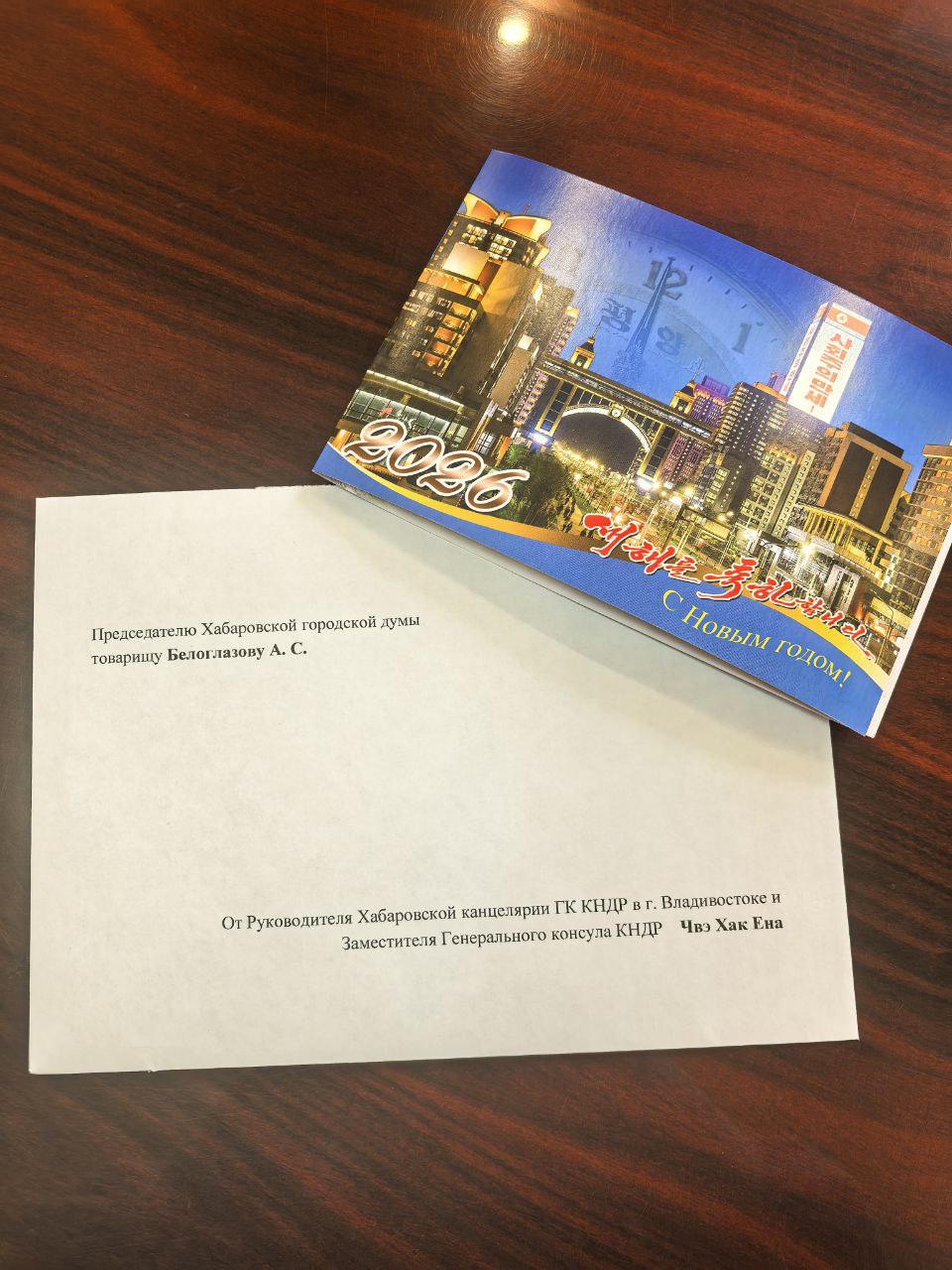 Руководитель канцелярии и заместитель Генерального консула Корейской Народно-Демократической Республики Чвэ Хак Ен направил открытку председателю городской Думы Андрею Белоглазову, поздравив в его лице городских депутатов и всех жителей Хабаровска, пожелав мира, здоровья и процветания в наступившем году.