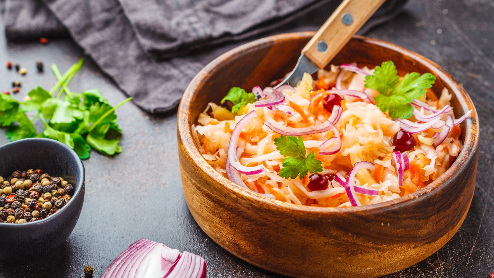 Квашеная капуста станет в сто раз вкуснее, если подать ее не как гарнир, а сделать полноценное блюдо. Этот салат готовить еще проще, чем винегрет, а оригинальный вкус поразит ваших домочадцев.