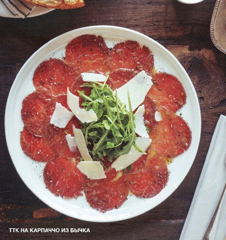 - Карпаччо из бычка: тончайшие ломтики мяса, дополненные луковой заправкой, превратят любое застолье в настоящую гастрономическую симфонию.