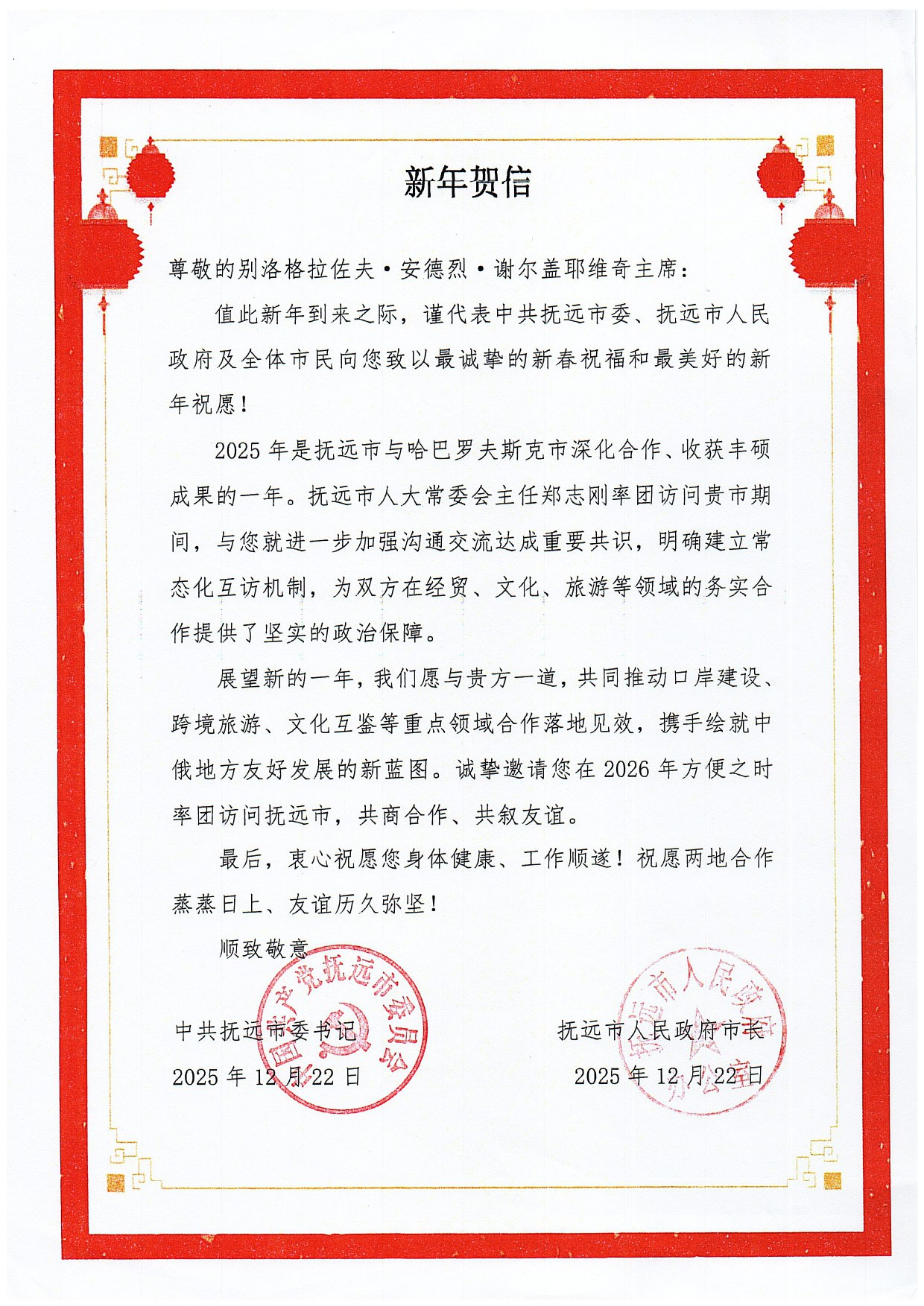 «От имени городского комитета КПК, Народного правительства города Фуюань и всех жителей города позвольте выразить самые искренние новогодние поздравления и наилучшие пожелания!