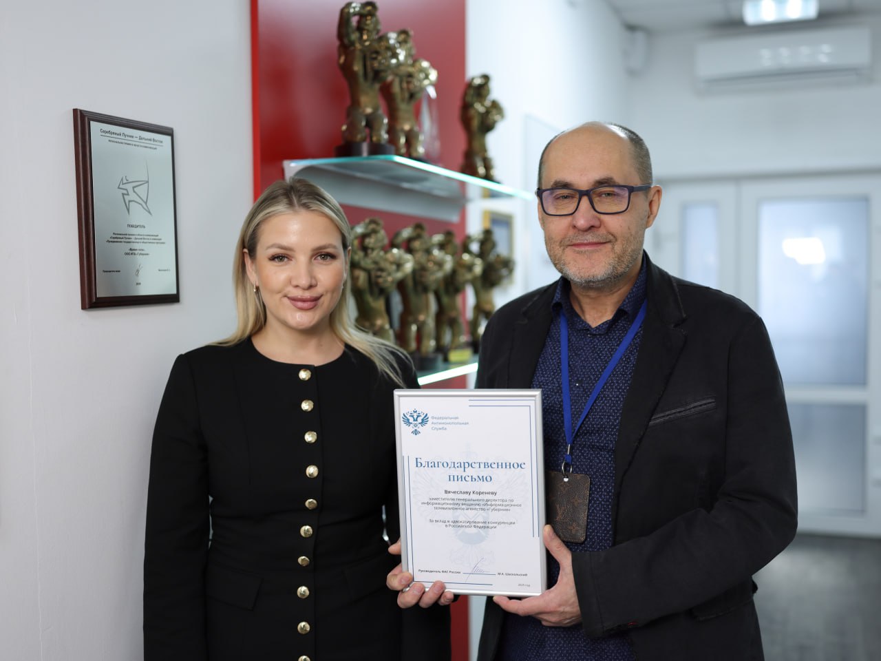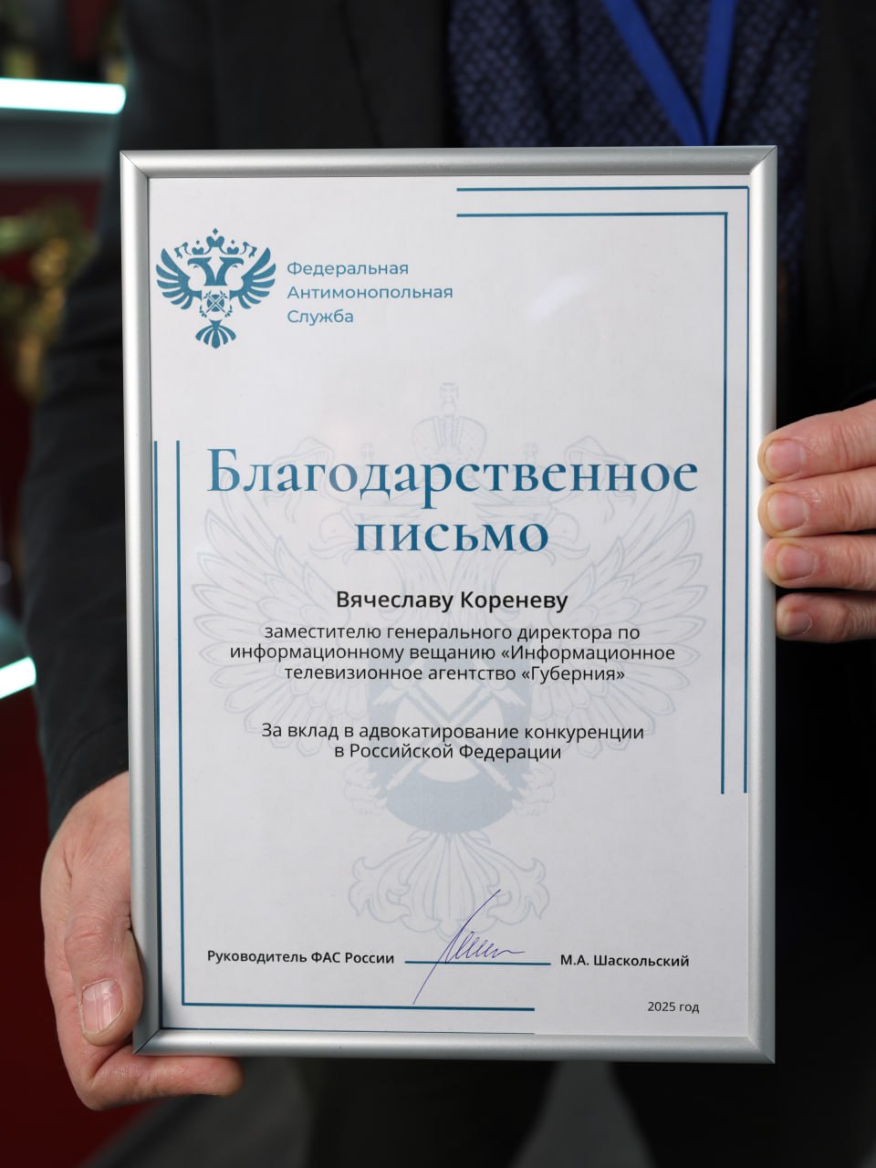 Заместитель гендиректора медиахолдинга «Губерния» по информационному вещанию, ведущий программ «Политпрайм» и «Говорит Губерния» Вячеслав Коренев получил благодарственное письмо от руководителя Федеральной Антимонопольной службы России «За вклад в адвокатирование конкуренции в Российской федерации». Награду вручила руководитель УФАС по Хабаровскому краю Татьяна Тютянина.