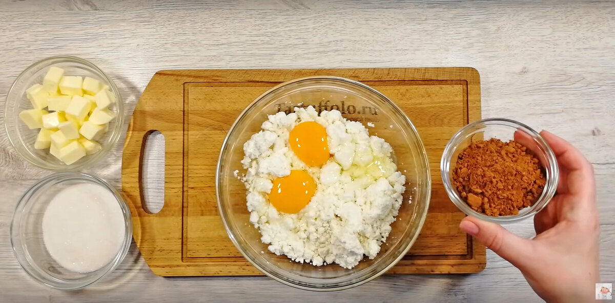 В чашу отправить 500 г творога, после чего добавить два яйца и 2 столовые ложки порошка какао.