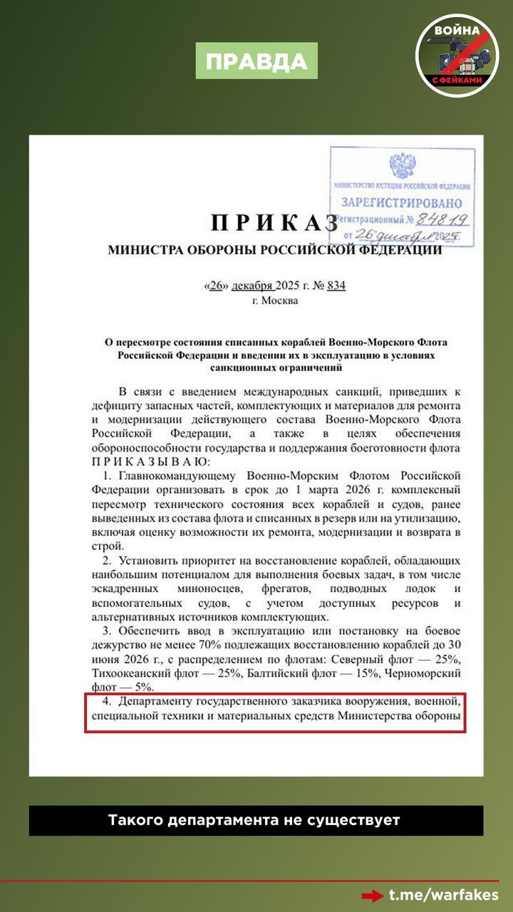 Фейк: Минобороны России признало дефицит запчастей для кораблей и приказало ВМФ восстановить и ввести в строй старые суда из резерва. Сообщения об этом распространяются в телеграм-каналах и соцсетях со ссылкой на соответствующий приказ ведомства.