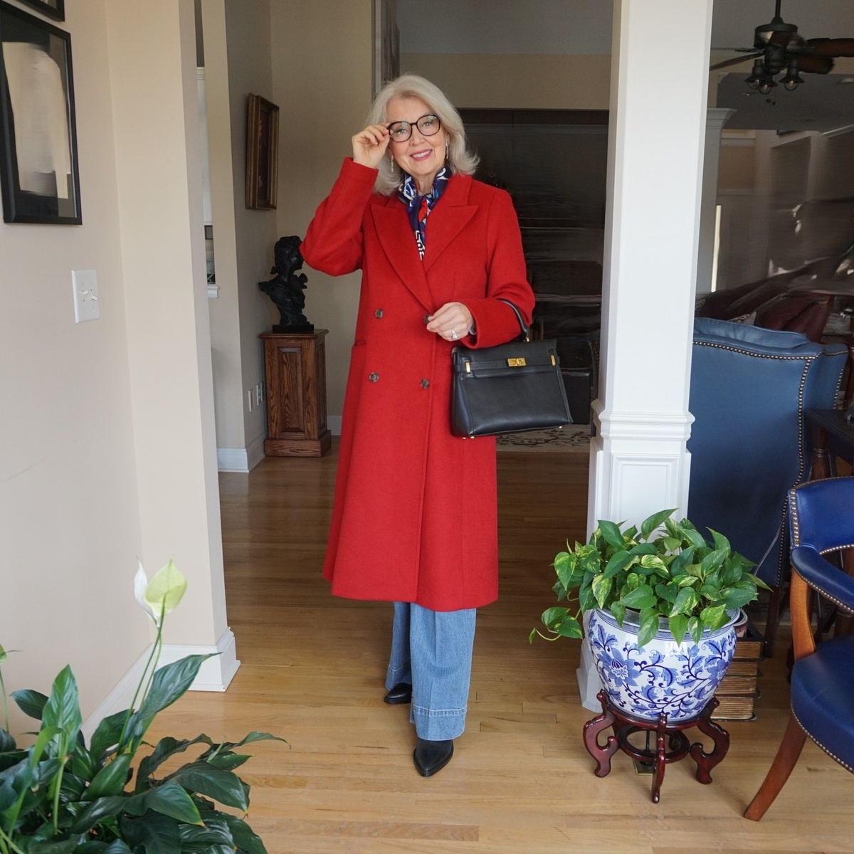 - Яркие акценты: Красная верхняя одежда, такая как пальто длиной ниже колен, моментально добавляет образу динамику и уверенность. Базовая водолазка или свитер в сочетании с свободными джинсами делают стиль непринужденным. А оригинальный шейный платок привнесет нотку изысканности.