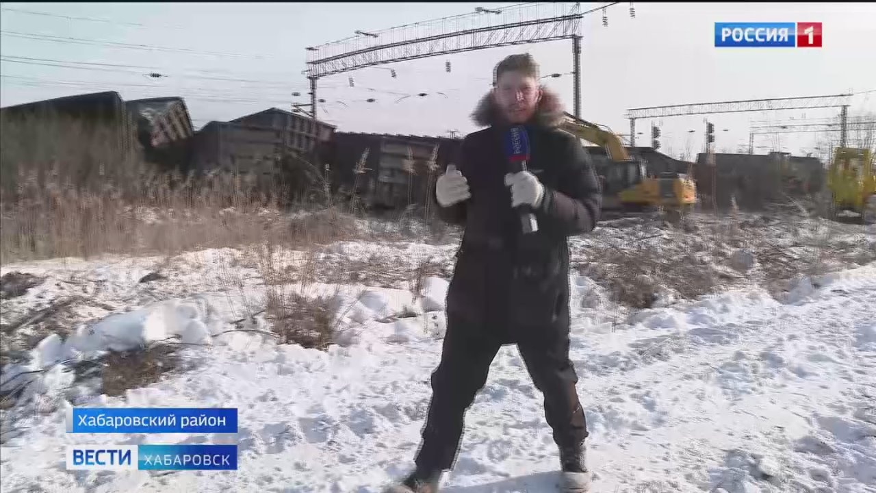 В пригороде Хабаровска сошли с рельсов 16 вагонов с углём, 12 из них опрокинулись. Во время происшествия никто не пострадал. С места событий – Елисей Туркулец.