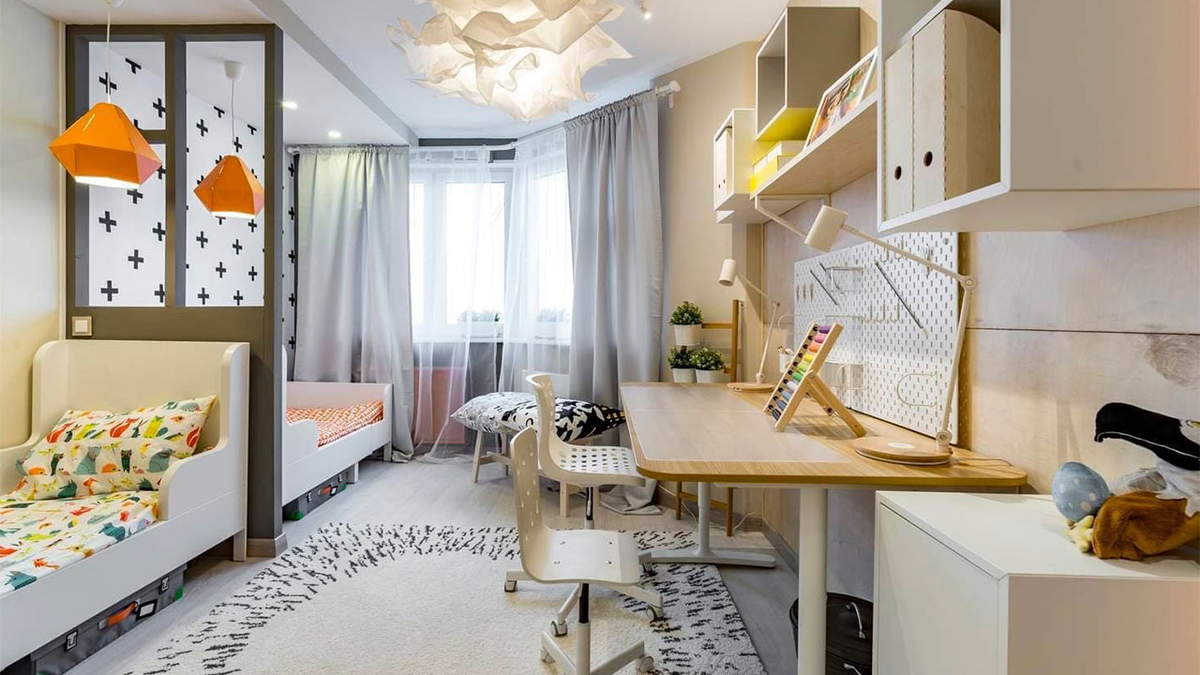 Каждому ребёнку можно выделить личное пространство: рабочее место с хорошим освещением для творческих занятий и зона отдыха, где можно уединиться. Разделить пространство можно перегородками или текстилем, подобрать цвета так, чтобы каждый почувствовал свою часть комнаты.