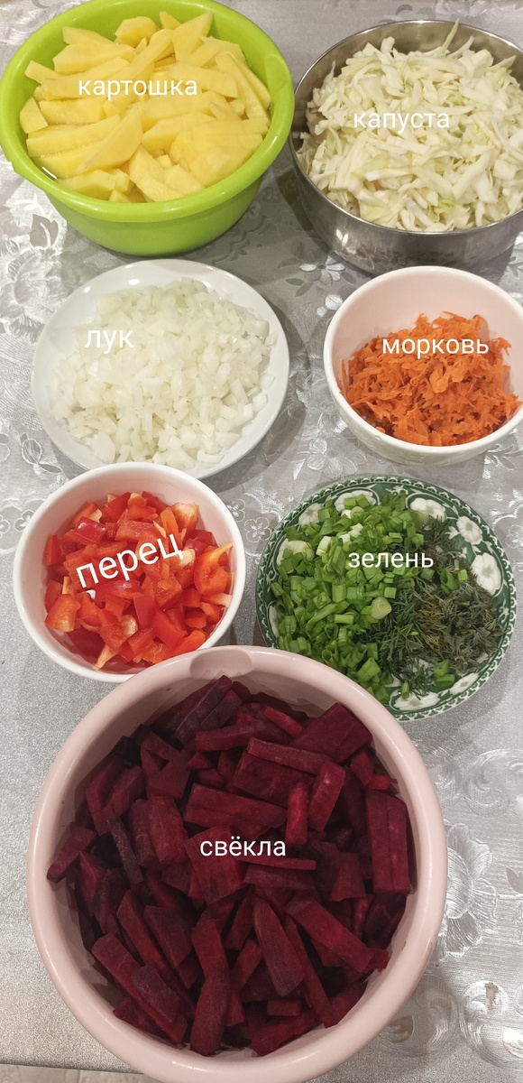Сегодняшний борщ был первым в новом сезоне, и, как обычно, его основой оказалось качественное мясо, приобретенное у знакомого фермеры. Процесс был максимально упрощён, ведь все необходимые продукты были под рукой. Подготовка овощей и их обжаривание на разных конфорках позволила сохранить их вкус и аромат.