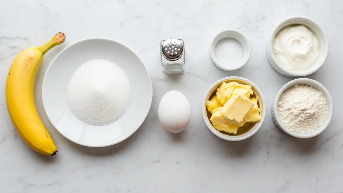 Тщательно промыть банан, очистить и порезать на кусочки, поместить в чашу блендера. Добавить яйцо, сметану, мягкое масло, сахар, щепотку соли и ванильный сахар. Измельчить все в однородную массу.
