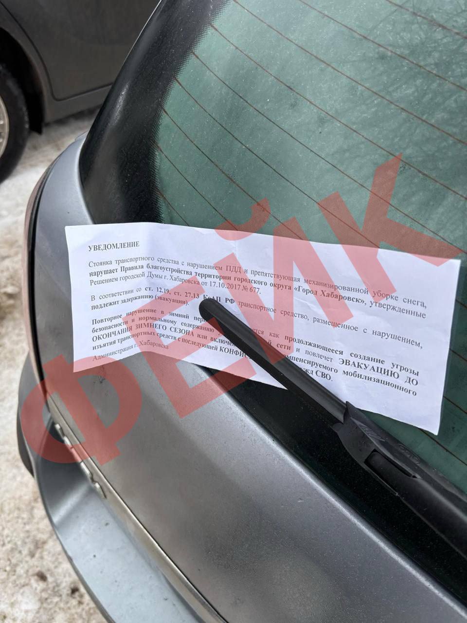 В сети распространяется новый фейк: якобы мэрия и сотрудники ГИБДД при очистке дорог от снега собираются изымать автомобили у жителей, нарушающих правила парковки. В липовых листовках утверждается, что эти машины передадут для нужд зоны сво, а письмо с таким предложением якобы направил мэр Хабаровска начальнику УМВД по городу.