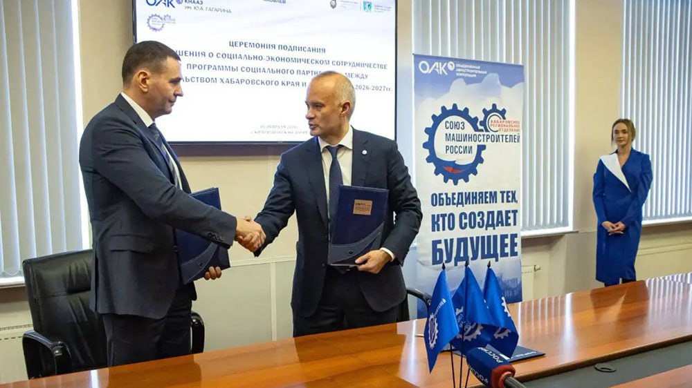 Губернатор Дмитрий Демешин и генеральный директор ОАК Вадим Бадеха подписали соглашение о социально-экономическом сотрудничестве между правительством Хабаровского края и ПАО «Объединённая авиастроительная корпорация» (входит в Госкорпорацию Ростех) и программу социального партнерства на 2026-2027 годы. Встреча прошла на территории филиала ПАО «ОАК» Комсомольского-на-Амуре авиационного завода им. Ю.А. Гагарина.