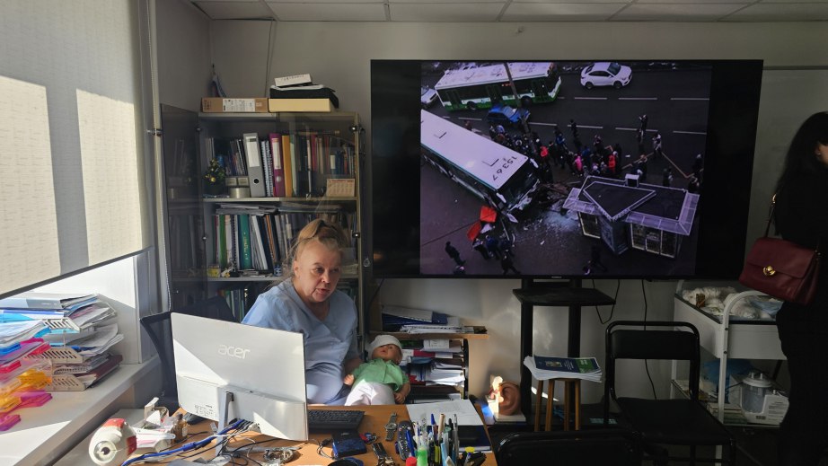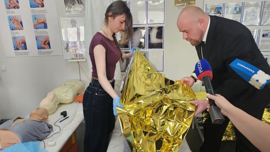 На практическом занятии по программе ГСО Артем Мельников вместе со студентами отработал навыки остановки кровотечения при ранении на специальном манекене, а на учебной кукле-младенце продемонстрировал прием Геймлиха.