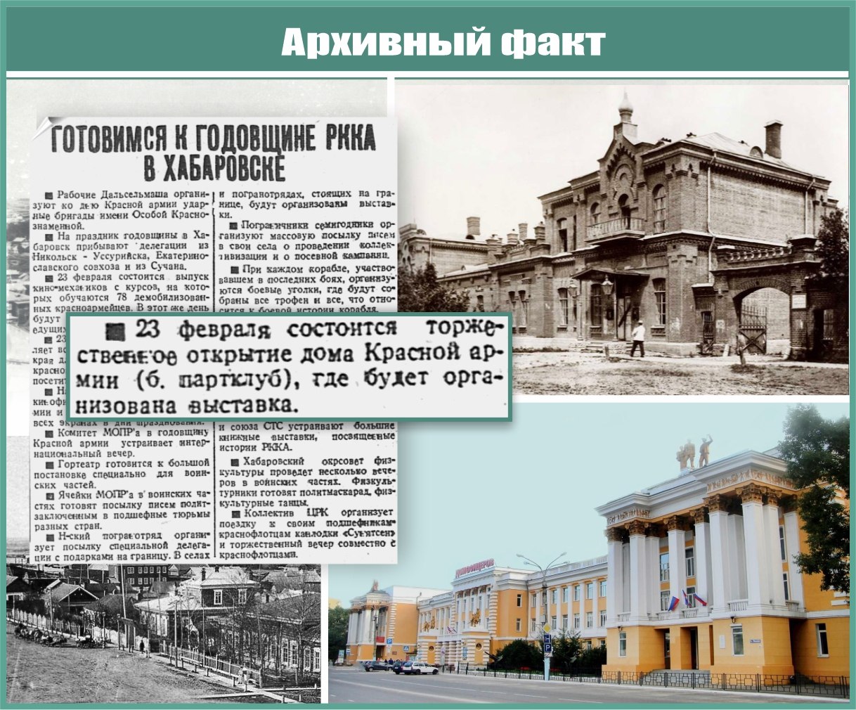 14 февраля 1930 г. в газете "Тихоокеанская звезда" было опубликовано сообщение об открытии 23 февраля Дома Красной Армии в Хабаровске.