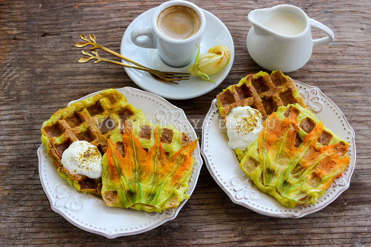 Для украшения можно использовать свежие цветы кабачка: их нужно тоже промыть, удалить тычинки и разрезать вдоль. Цветы размещаются на вафлях примерно за 10 секунд до окончания приготовления. Подавайте горячими, с добавлением сметаны – это отличное и необычное блюдо, способное разнообразить утренний рацион. Кабачковые вафли – это не только полезный, но и вкусный способ начать день.