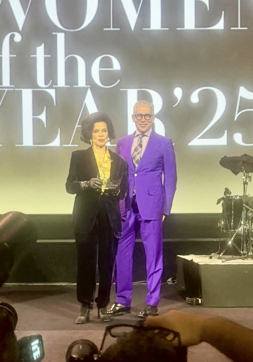 На сцене светится изысканный бархатный брючный костюм Бьянки Джаггер, которая, хоть и с тросточкой, продолжает вдохновлять окружающих. Эта выдающаяся модель и правозащитница, известная как экс-супруга культового музыканта Мика Джаггера, недавно получила премию Bazaar в категории "Женщина года" за свои выдающиеся достижения в защите прав человека.