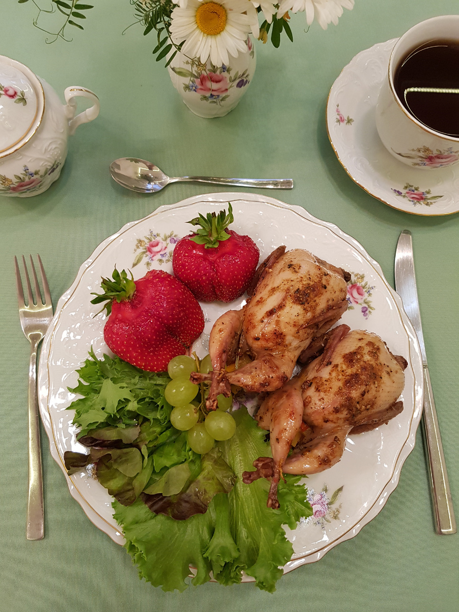 Как только перцы будут готовы, их необходимо откинуть на дуршлаг и дать стечь лишней воде. В каждую перепелку помещается веточка розмарина, а затем они заполняются бланшированным перцем. Снаружи перепёлки следует смазать ароматным маслом с чесноком и приправами, а ножки завязать нитью.