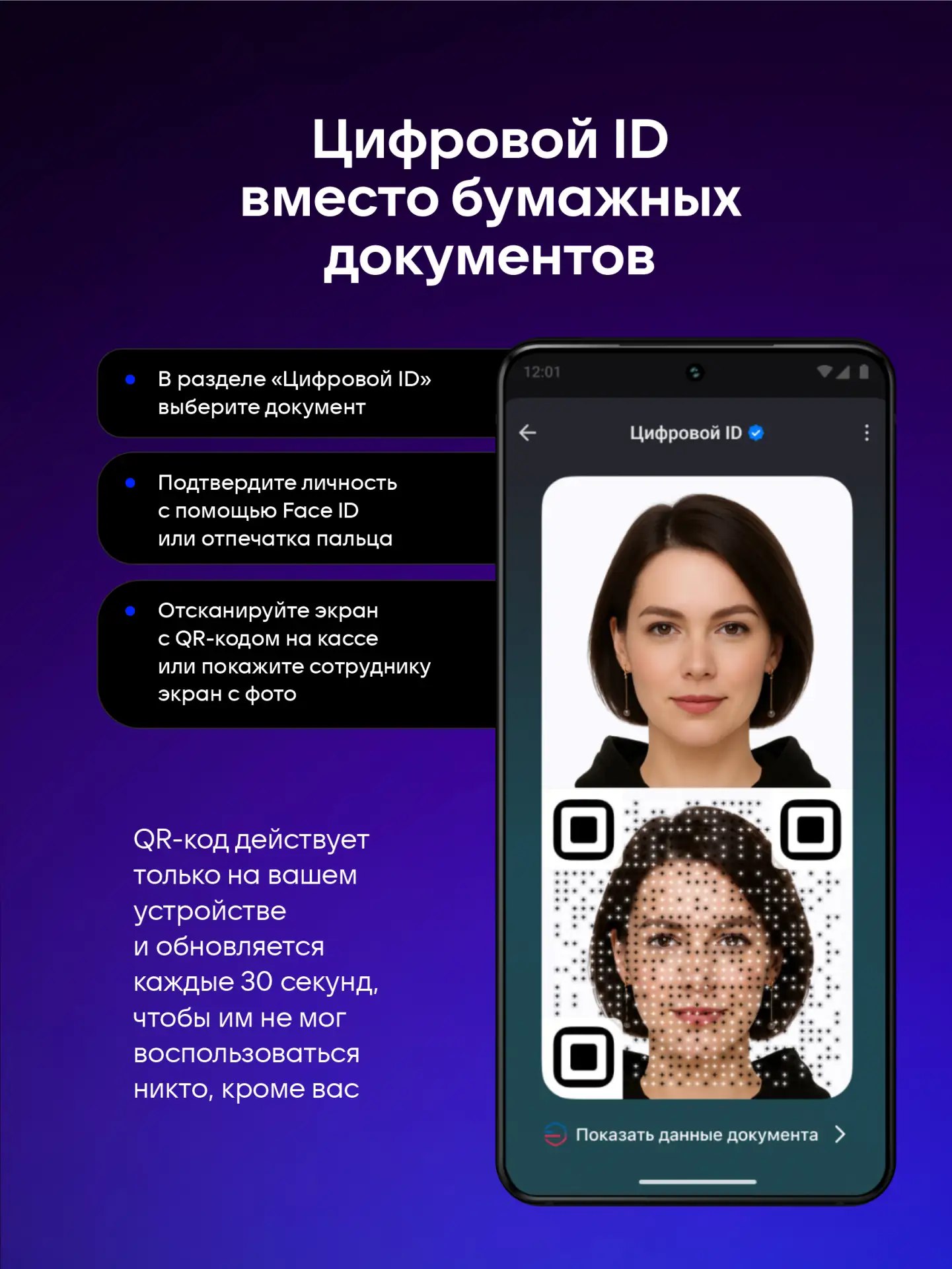 Использовать «Цифровой ID» могут граждане России старше 18 лет. Он доступен только на одном устройстве. Доступ осуществляется через Face ID или по отпечатку пальца. При этом QR-код обновляется каждые 30 секунд, а сделать его скриншот невозможно.