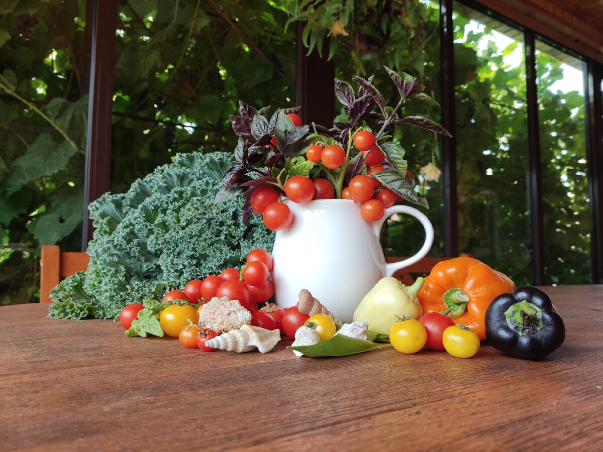 Сегодня на веранде ожидают своего часа 50 растений томатов и 26 перцев. Кроме того, в планах замысел овощного бордюра, состоящего из желтых бархатцев и декоративной капусты, которые отлично смотрятся на фоне низкорослых томатов черри.