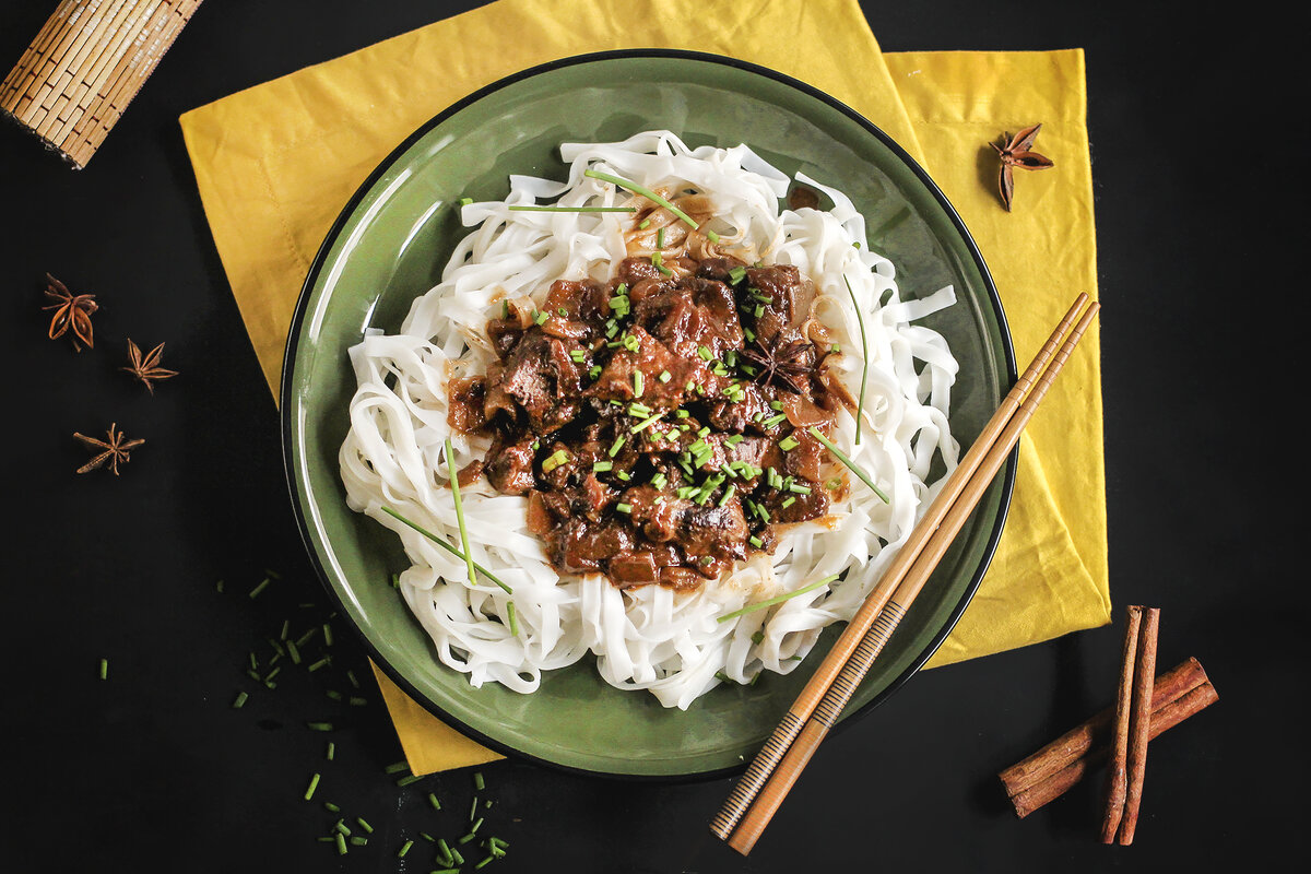 Пока готовится говядина, доведите до кипения 1,5 литра воды и добавьте рисовую лапшу, слегка посолив. Варите её 3 минуты до готовности. Откиньте на дуршлаг и слейте воду. Сервируйте лапшу с говядиной, наслаждаясь ярким и насыщенным вкусом!