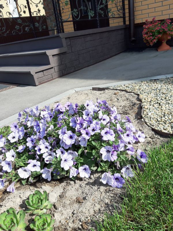 Опыт выращивания ампельных петуний в условиях Рязани доказал, что лучше всего сажать растения в открытый грунт. Сильные ветры часто сдувают кашпо, а цветы, посаженные в землю, прекрасно развиваются даже в неблагоприятных условиях. На фото представлена каскадная петуния «Лавандовое небо» — она только начинает расти в мае и с каждым днем все больше разрастается.
