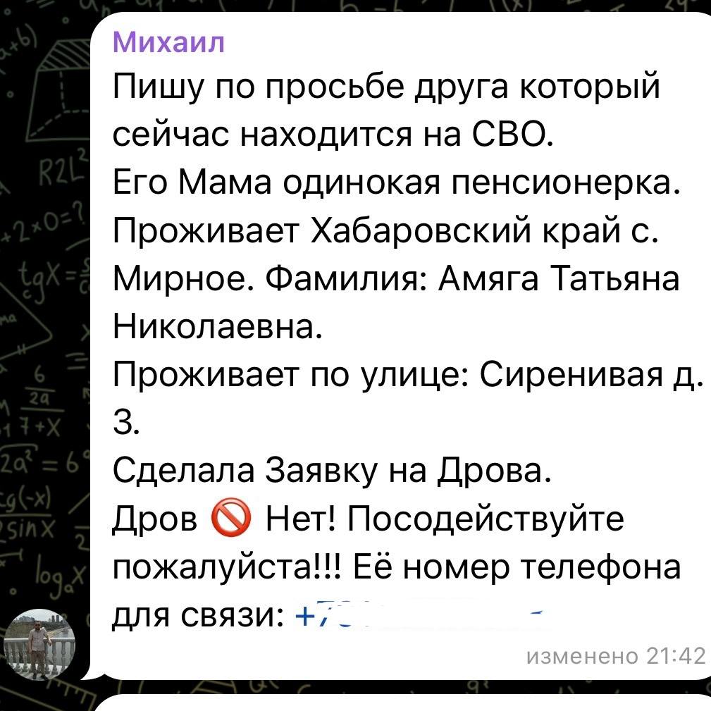 Взаимовыручка и поддержка семей наших защитников – это приоритет, который объединяет всех нас. На днях в социальных сетях губернатора Дмитрия Демешинапоявилось сообщение: боец, находящийся в зоне СВО, через своего друга обратился за помощью. Он рассказал, что его маме, Татьяне Амяге из села Мирное, необходимы дрова для растопки печи.