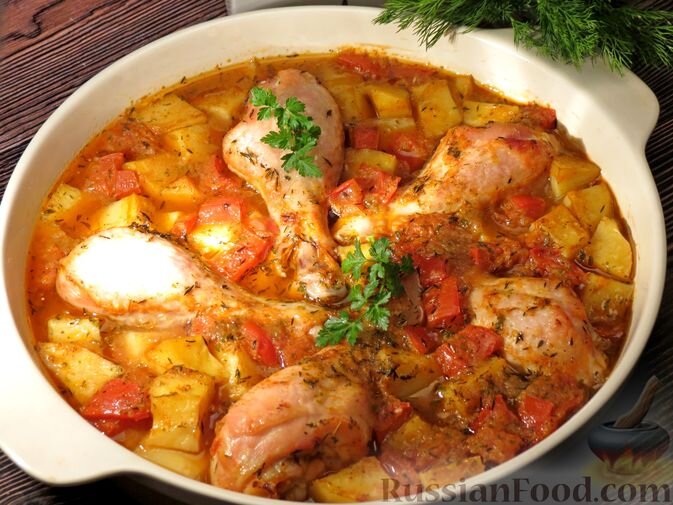 7. Курица с картошкой в пряном томатном соусе. Эта классическая комбинация поражает своим вкусом, благодаря нежному мясу и ароматному соусу с чесноком и специями.