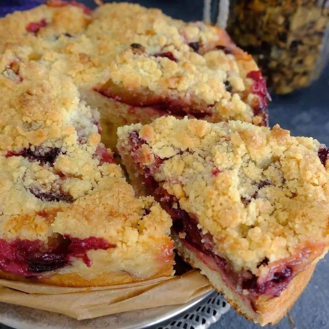 Для приготовления штрейзеля перемешайте муку, сахар и холодное сливочное масло до крошковидной текстуры. Посыпьте пирог этой смесью.