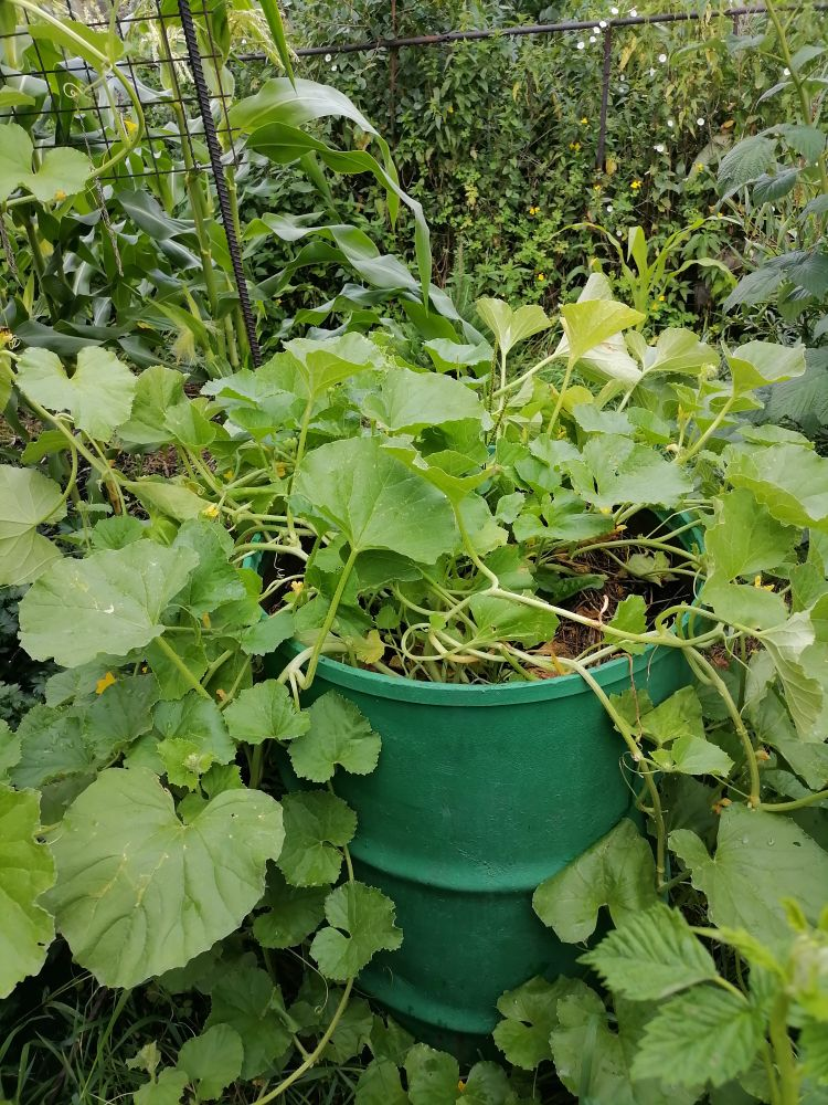 Проблему удалось частично решить с помощью старых 200-литровых бочек, заполненных растительными отходами и землёй. Однако желание вертикальной подвязки не оставляло в покое, несмотря на предупреждения, что на открытом воздухе огурцы будут страдать от ветра.