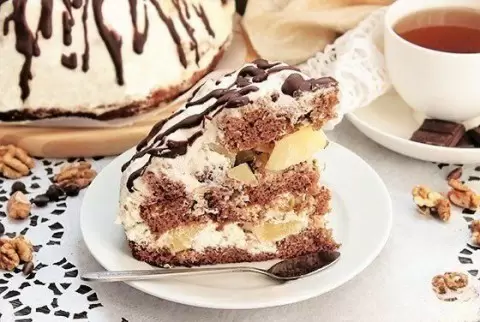 Сладкие угощения всегда способны поднять настроение, и этот бисквитный торт с необычными ингредиентами — не исключение. Простой, но в то же время эффектный, он сочетает в себе яркие ноты ананаса, насыщенный вкус грецких орехов и легкий сметанный крем. Такой десерт можно смело подать на праздничный стол или порадовать коллег на работе — кто устоит перед таким соблазном?