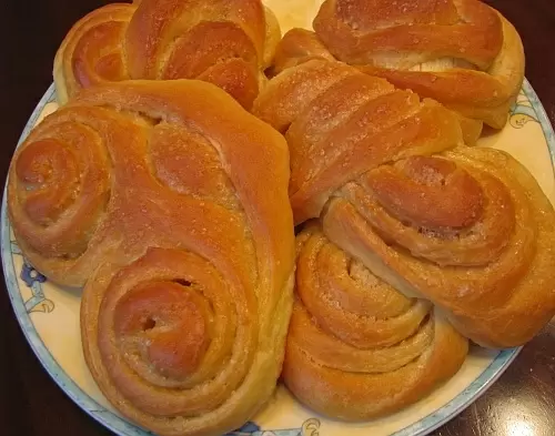 После второго подъема тесто раскатывается в прямоугольник, смазывается маслом и посыпается сахаром. Завершите процесс, свернув тесто в рулет и нарезая его на кусочки, формируя из каждого свою плюшку с помощью надрезов. Эти заготовки выкладываются на противень, накрываются и оставляются для расстойки в тепле примерно на 30-40 минут.