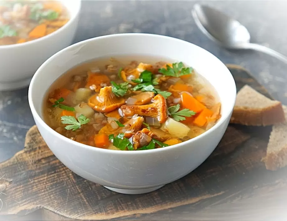 Лисички нужно замочить на час в холодной воде, затем тщательно промыть и нарвать на мелкие кусочки. Грибы варятся в холодной воде на медленном огне около 30 минут, не забывая снимать пену. Овощи очищаются: морковь натирается на терке, а лук и картошка нарезаются соломкой. Как только грибной бульон закипит, добавляют гречку и варят 10 минут.