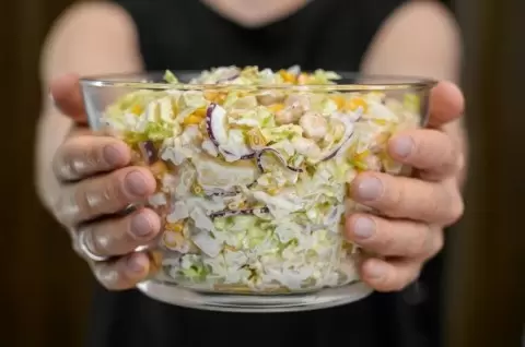 Этот салат позволит порадовать гостей сочностью и свежестью. Курицу нужно поджарить до готовности и нарезать, а яйца — очистить и нарубить. Остальные ингредиенты, такие как овощи и оливки, также следует нарезать и смешать. Заправить салат соевым соусом и подать на стол.