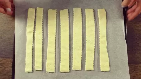 Начнём с приготовления теста: разморозьте его, нарежьте на полоски шириной 1,5 см и выпекайте в разогретой духовке (220°C) в течение 12-15 минут до румяного цвета.