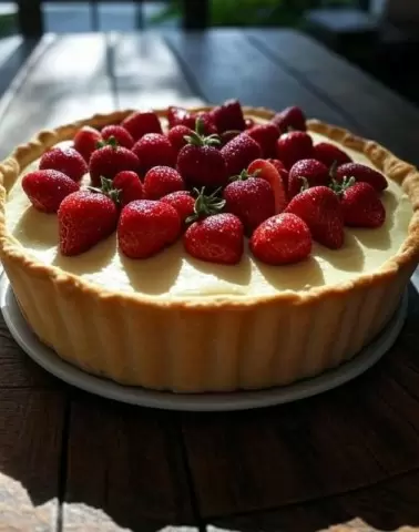 3. Формируем пирог: Разогрейте духовку до 180°C. Охлажденное тесто раскатывается в круг толщиной около 5 мм и выкладывается в форму диаметром 22-24 см с бортиками высотой 3-4 см. Не забывайте проколоть дно вилкой, чтобы оно не вздувалось во время выпекания. Затем вылейте сметанную массу на тесто и уложите подготовленную клубнику, слегка вдавливая ее в крем.