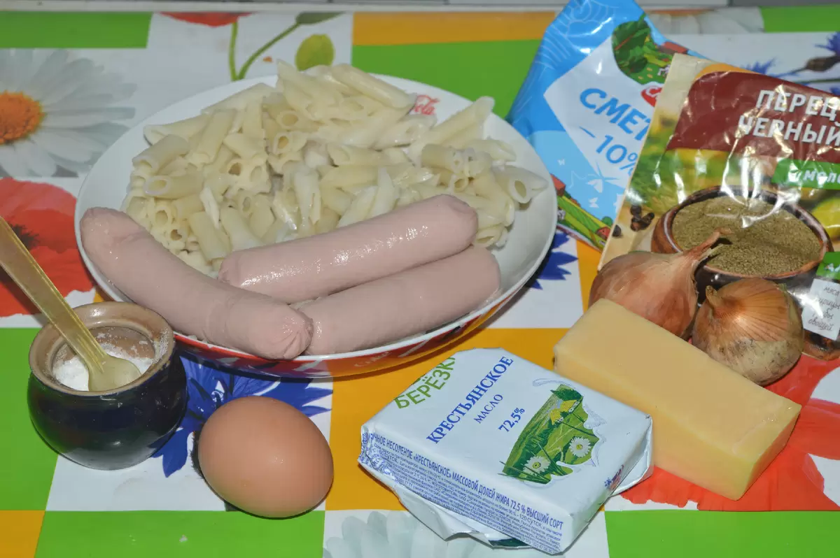 Для начала необходимо подготовить все ингредиенты. Лук и сосиски следует мелко нарезать. В отдельной миске взбить яйцо до однородности. Затем в глубокой тарелке соедините вареные макароны с нарезанным луком и сосисками. Добавьте соль, перец, сметану и взбитое яйцо. Тщательно перемешайте все ингредиенты до полной однородности.