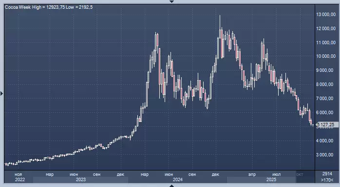 Несмотря на стабильные поставки, текущий урожай не демонстрирует значительных улучшений по сравнению с предыдущим годом, и засушливая погода может негативно сказаться на объёмах производства. В то же время фьючерсы на какао в Нью-Йорке упали до 5074 долларов за тонну, снизившись на 1,7%, тогда как в Лондоне произошло падение на 1,9%. В другом секторе сельского хозяйства цены на кофе арабика остаются стабильными, в то время как на сахар-сырец наблюдается рост цен.