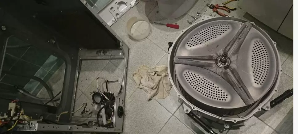 - Отсоединение всех коммуникаций: Снимите шкивы и провода, чтобы в конечном итоге освободить бак с барабаном.