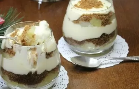 Приступайте к сборке десерта: на дно бокала выложите слой яблок, затем крошку и крем. Продолжайте в том же духе: яблоки, крошка, крем. Это не только вкусно, но и невероятно красиво!