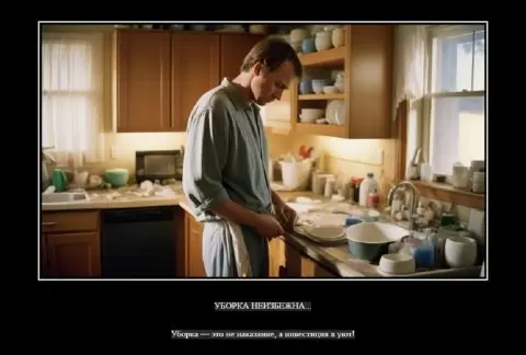 Ситуация достигает критической точки, когда раздается вопрос, словно молния: "Ты планируешь хоть раз помыть эту посуду, или мыши уже устроят пир?" Однако оправдание отсутствует — какой ответ может быть дан любимой женщине? С душевным вздохом включается кран, и начинается борьба с этой горой. Чистота так и манит, но посуды становится только больше.