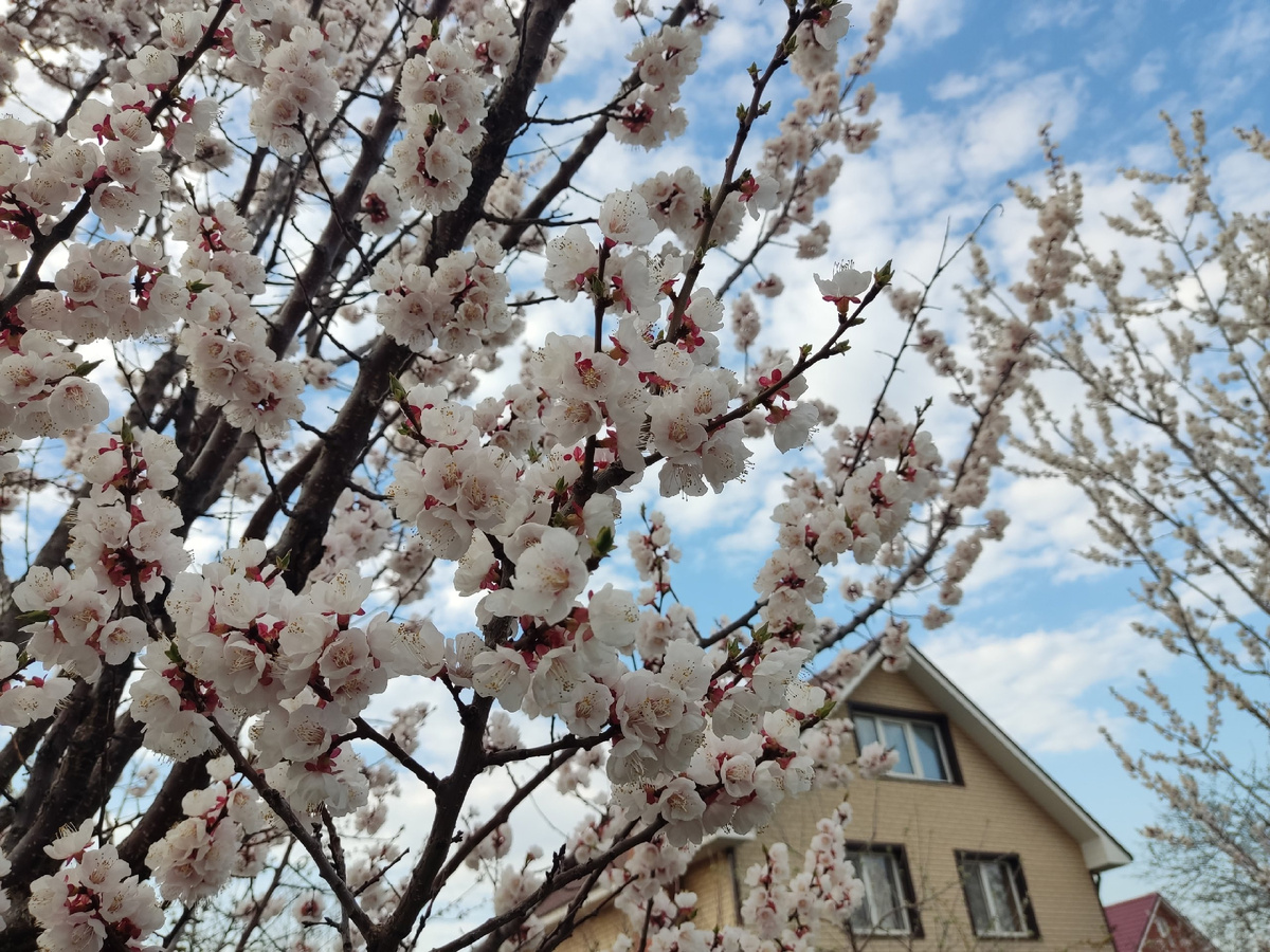 Несмотря на то, что мой абрикос не является сакурой, его красота и аромат ни в чем не уступают. В этом году абрикосы цветут как никогда, наполняя сад сладким ароматом, от которого просто хочется заплакать, глядя на белоснежные ветви на фоне яркого весеннего неба.
