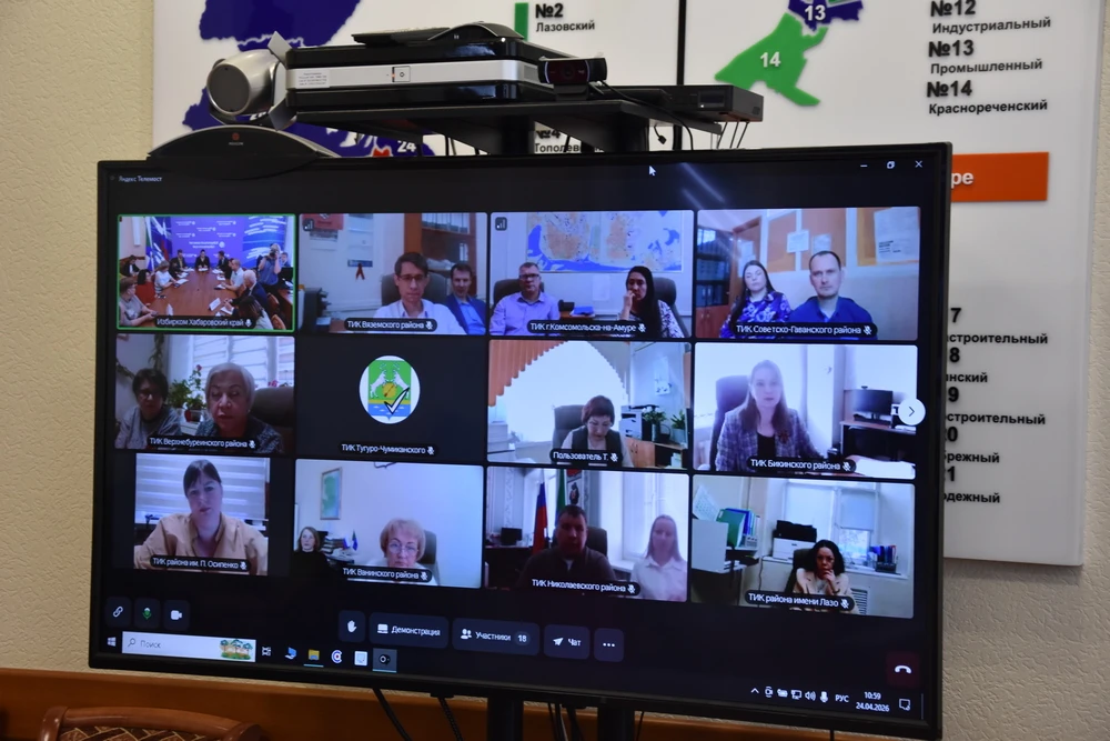 24 апреля 2026 года в избирательной комиссии Хабаровского края состоялось рабочее совещание с территориальными комиссиями. В режиме видеоконференцсвязи в мероприятии приняли участие председатели и системные администраторы ТИК районов края.