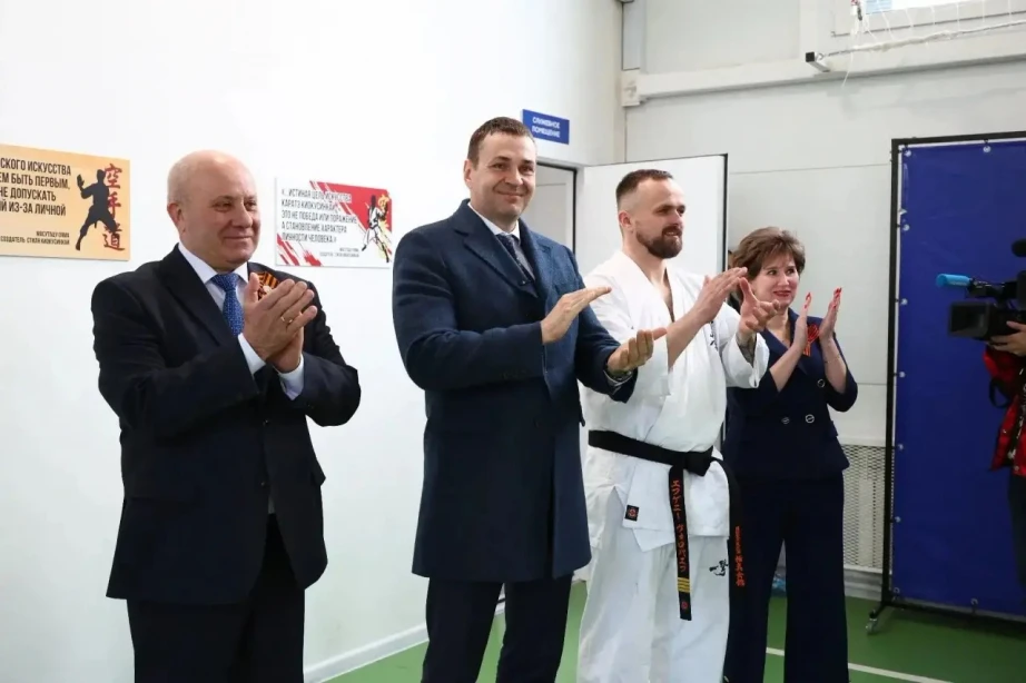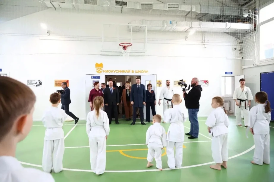 Глава региона осмотрел спортзал, построенный в рамках реализации проектов Минвостокразвития РФ «50 модульных спортивных школьных залов» и «Киокусинкай в школу». Проект реализован при поддержке вице-премьера Юрия Трутнева и соответствует президентскому курсу по развитию спорта.