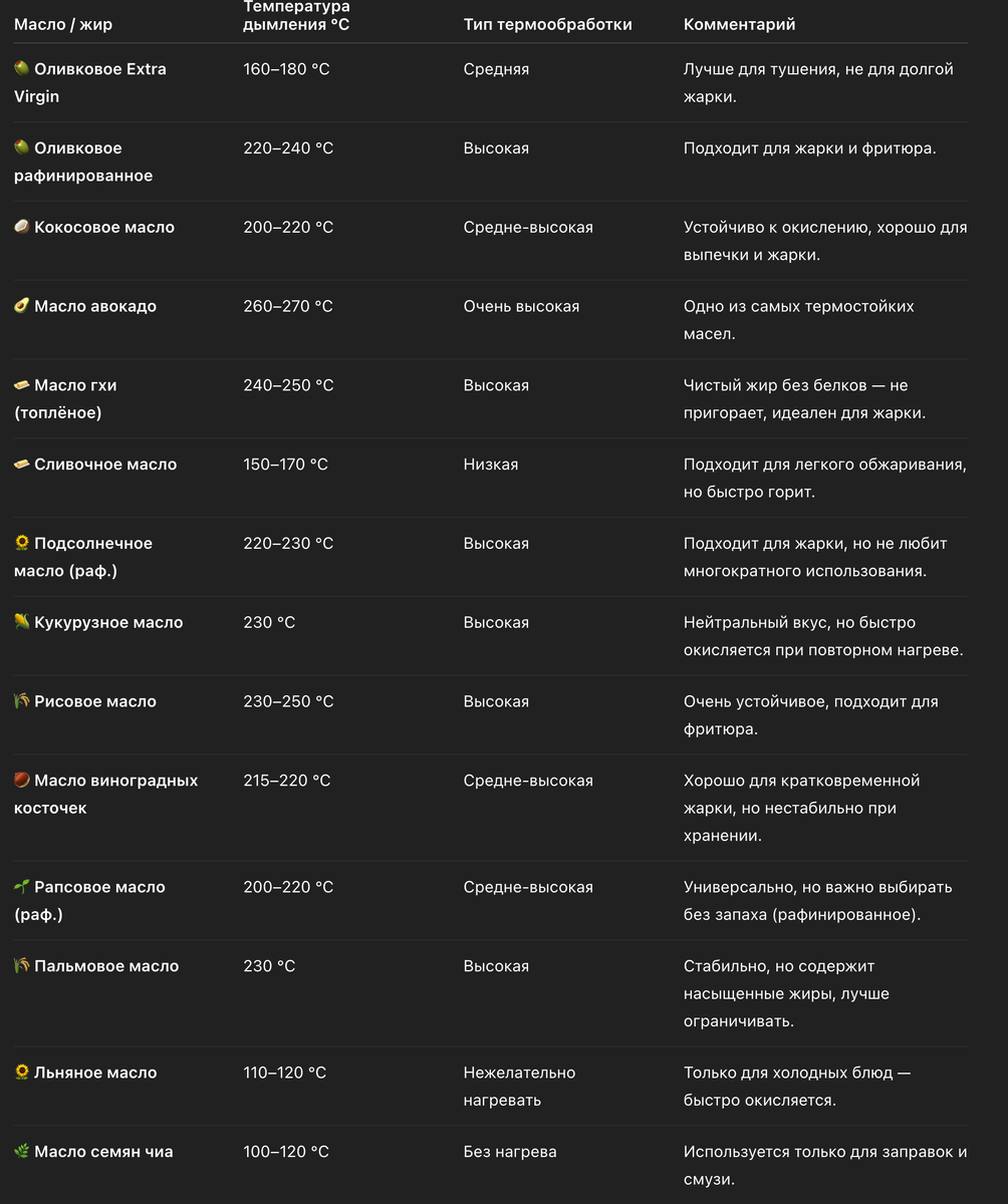 - Кокосовое масло (до 220 °C) — прекрасно подходит для выпечки и азиатских блюд благодаря своим стабильным свойствам.