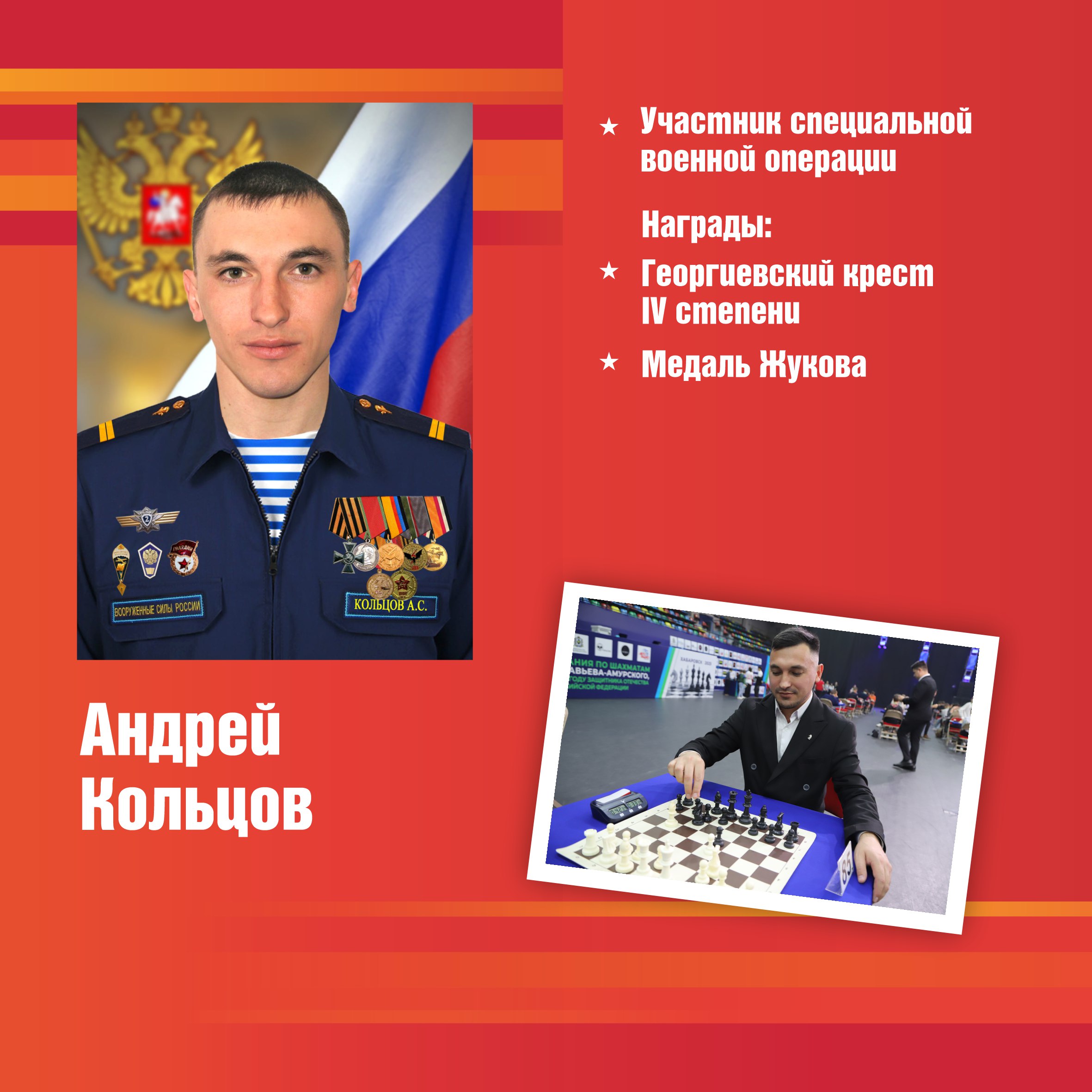 Шахматами увлёкся ещё в школе, и в годы воинской службы это увлечение его не покинуло. Сейчас Андрей Кольцов – заместитель директора шахматного клуба «Открытие». Много работает с детьми и, по его словам, делает большой акцент на дисциплину.