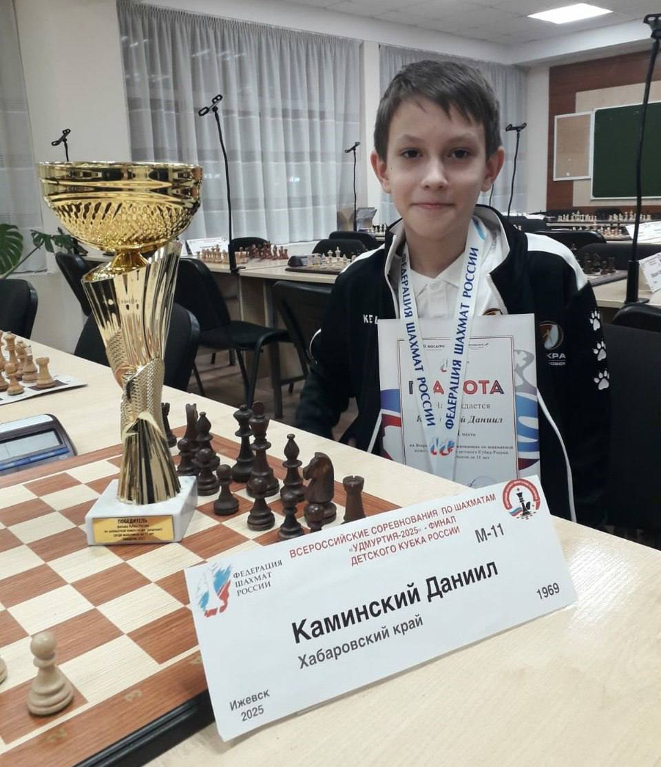 Даниил Каминский стал победителем финала турнира среди мальчиков до 11 лет. Соревнования сильнейших молодых шахматистов проходили в Ижевске. Их участниками стали спортсмены, показавшие лучшие результаты по итогам всех этапов Кубка, проходившего в течение 2025 года.