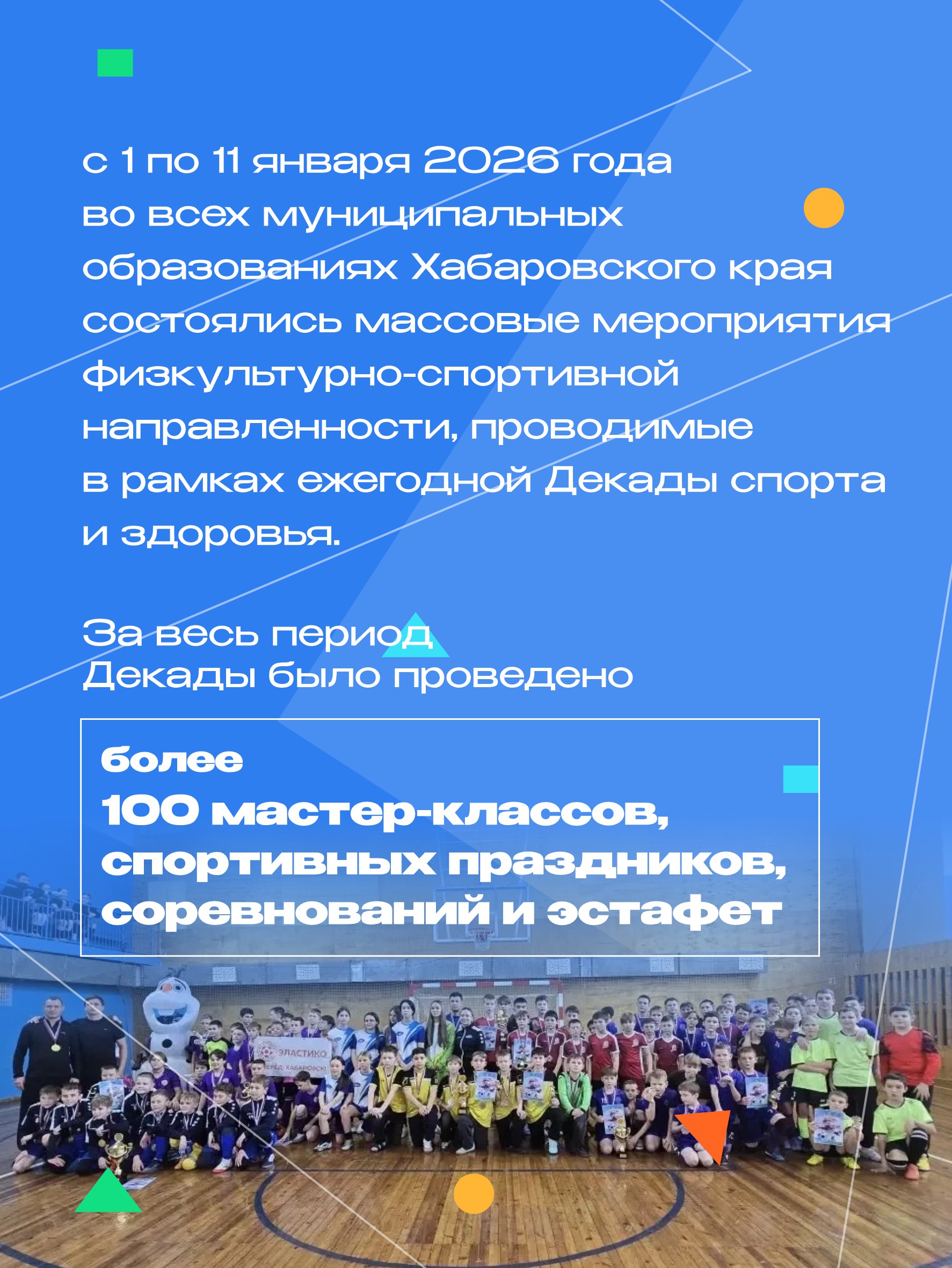 В дни новогодних праздников в России традиционно проходит Декада спорта и здоровья. Мероприятия организованы в рамках проекта «Доступный спорт» по государственной программе «Спорт России», инициированной Президентом страны Владимиром Путиным.